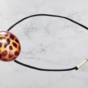 Leopard print effect dome decorative closure, pre-threaded with black elastic cord loop. An on-trend and eye-catching animal print effect gloss dome surface. Perfect if you want to make a statement!
