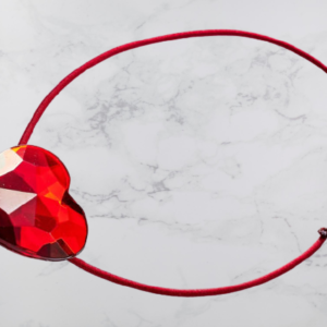 Ruby (dark red) heart shaped decorative gemstone closure, pre-threaded with dark red elastic cord loop.